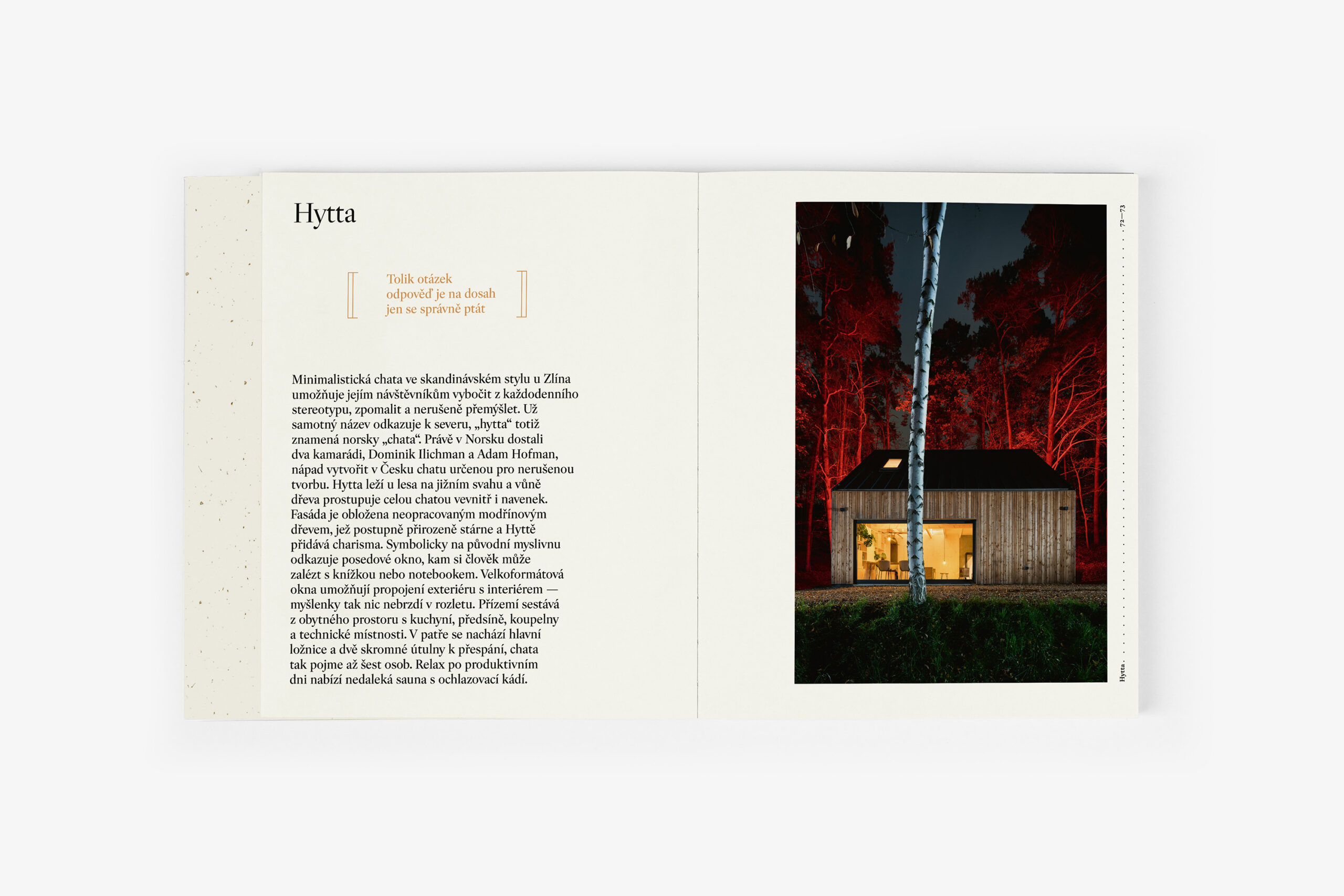 V knize na 368 stranách najdete kromě rozhovorů věnovaných chataření a chalupaření také 40 moderních chat a chalup od českých architektů. Editoři časopisu ARCHIZOOM vybírali z několika stovek tak, aby typově obsáhli ty nejmenší útulny až po luxusní horské apartmány. Inspirujte se, je moto již v pořadí třetí knihy z edice ARCHIZOOM.