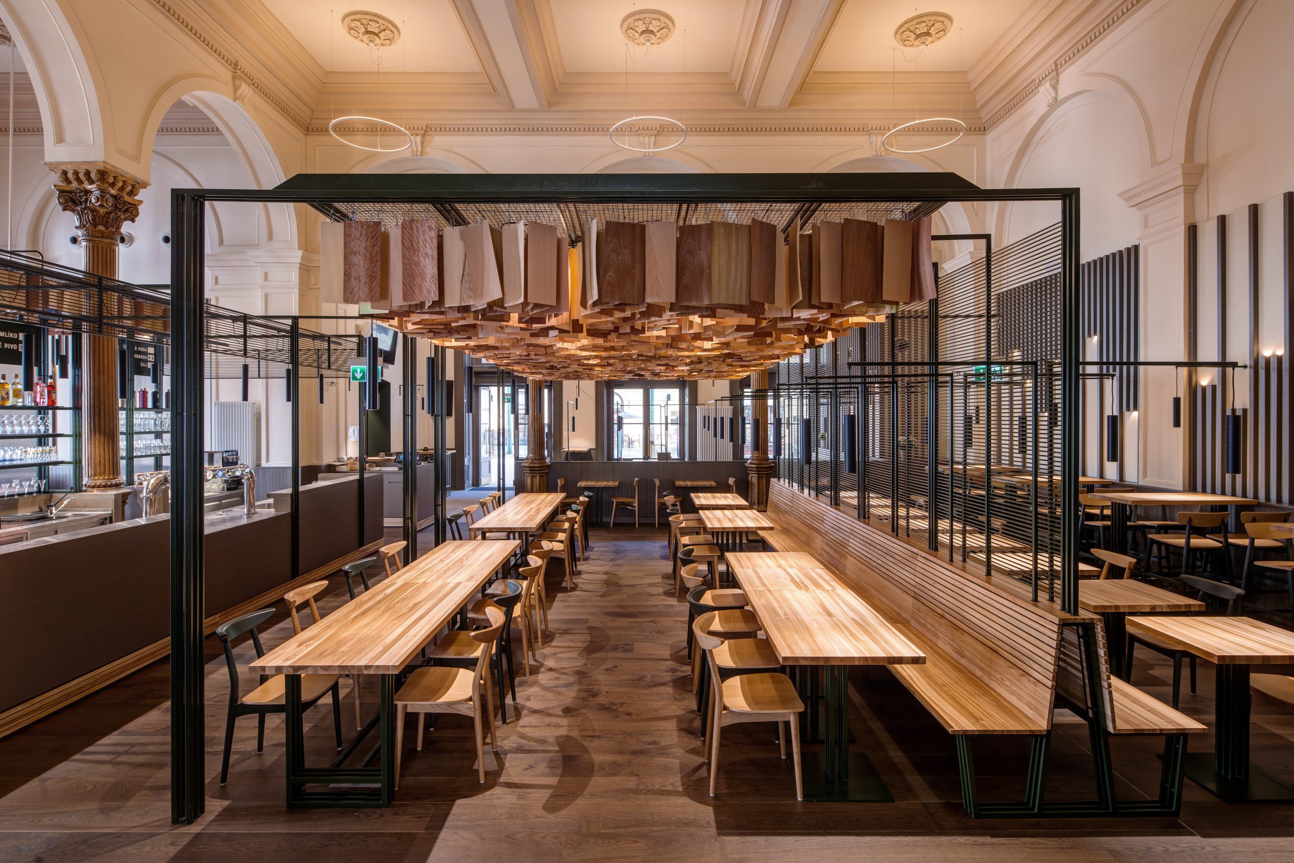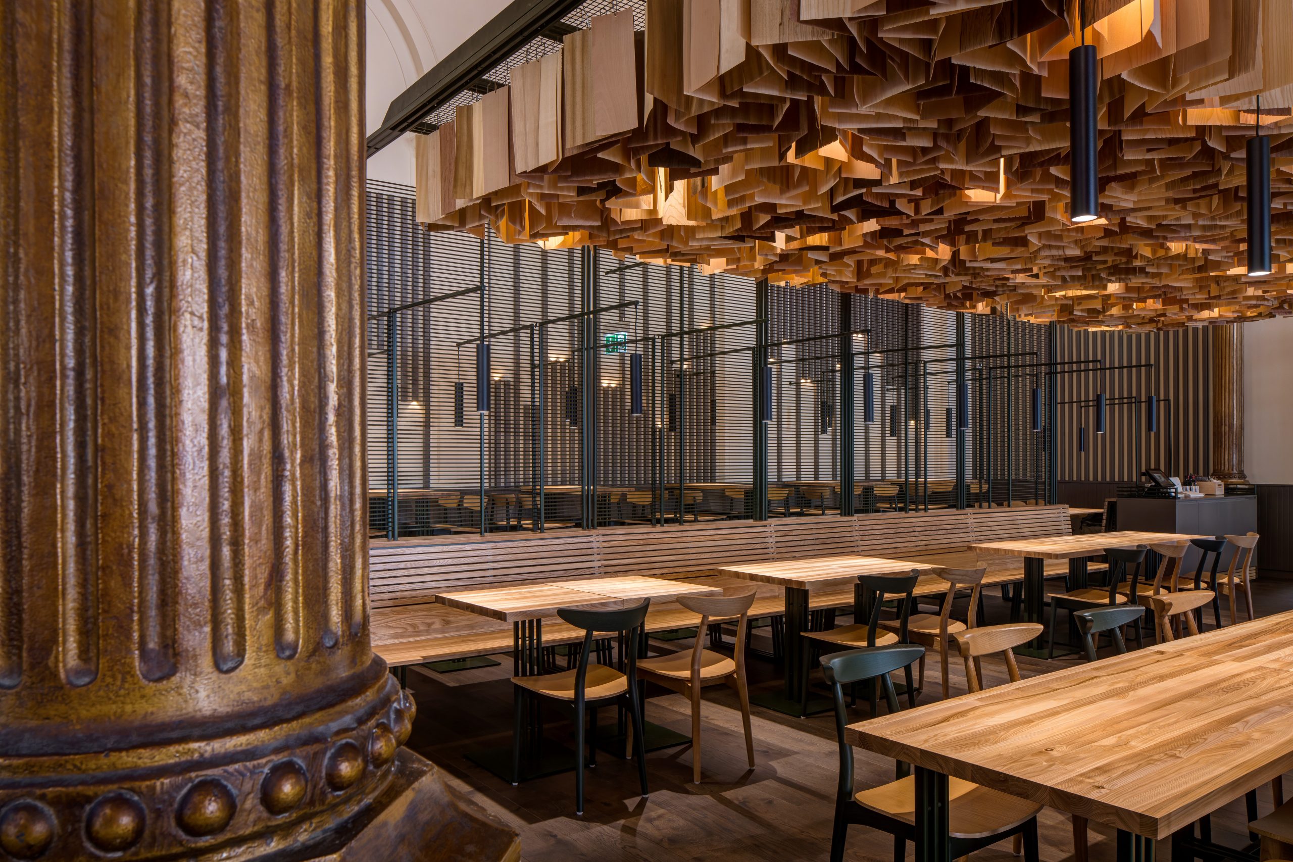 Historické prvky architekti studia archicraft nekopírují, ale inspirují se jimi. Pokud se někde objevuje prvek v minulosti tradičně používaný, vnesou mu nový nádech. Vytváří tak nové a zcela jedinečné interiéry se zachováním jejich historie. “Například jsme věděli, že původní podlaha v Císařské restauraci byla dřevěná. Rozhodli se tak proto také pro dřevo, ale dali jsme mu moderní charakter. Původní vlysy kladené do stromečku tak nahradila široká dřevěná prkna. Oživili jsme také tradici používání jasanového dřeva pro stoly a lavice v restauracích. Pro provoz je to naprosto vhodný materiál a jeho bohatá kresba dodává interiéru život a odstín zase dojem tepla,” vysvětluje architektka studia archicraft Lenka Bartoňová. Moderně pojali i dřevěné obložení stěn. Tvarování obkladů vychází z motivů linek trati při pohledu z ptačí perspektivy. Linie obkladu jsou tedy jakousi modifikací pohledu shora na depo se svítícími vlaky a vynikají tak svou dynamičností.