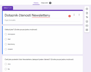 Google nabízí jednoduché řešení, které je zdarma. Stačí mít účet u Google a formuláře najdete na https://docs.google.com/forms. Nabízí základní nástroje pro tvorbu formuláře – stručná odpověď, delší odpověď, volba jedné odpovědi, možnost zadání více odpovědi, rozbalovací nabídka. Navíc zde najdete možnost lineární stupnice pro hodnocení na číselné škále a několik dalších. Důležitá je možnost rozdělit dotazník na sekce, které se pak odpovídajícím zobrazují jako jednotlivé stránky. Do sekcí máte možnost zadat obrázek nebo video.