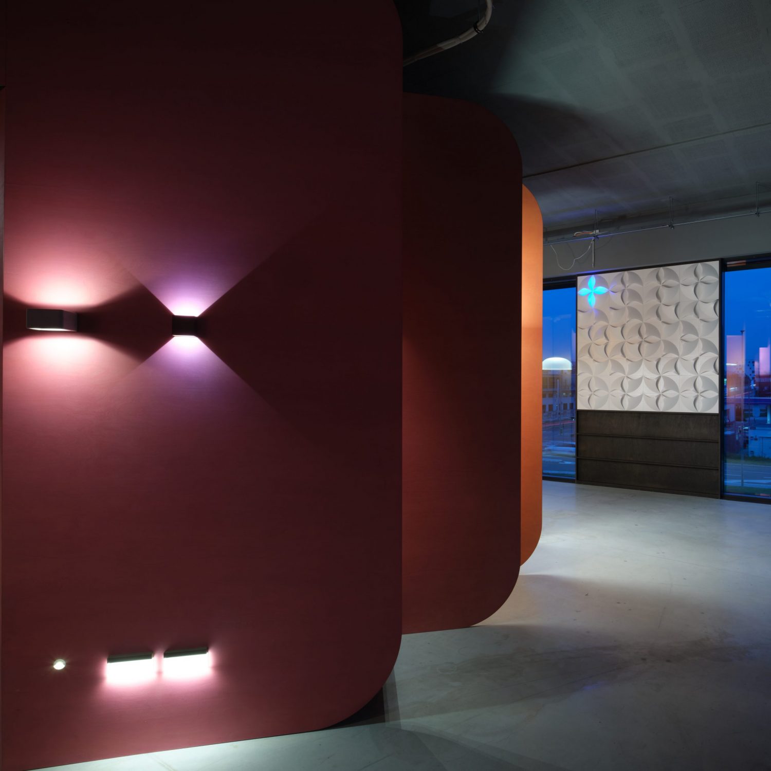 Ústředním bodem showroomu sídlícím v retail parku Poděbradská je nosná konstrukce z překližky vyvedená v barevném gradientu od fialové po oranžovou. Rozsvícená svítidla v oddělených sektorech tvoří zářící mikrokosmos, v němž vlnové délky světla krotí unikátními designy svítidel made in Italy v čele se značkou Stilnovo. V nabídce jsou designy od původních autorů i modely z 50. let. Mnohdy jde o svítidla, jež nebyla nikdy v prodeji, protože pro jejich produkci na základě návrhů do nynějška neexistovaly zdroje.