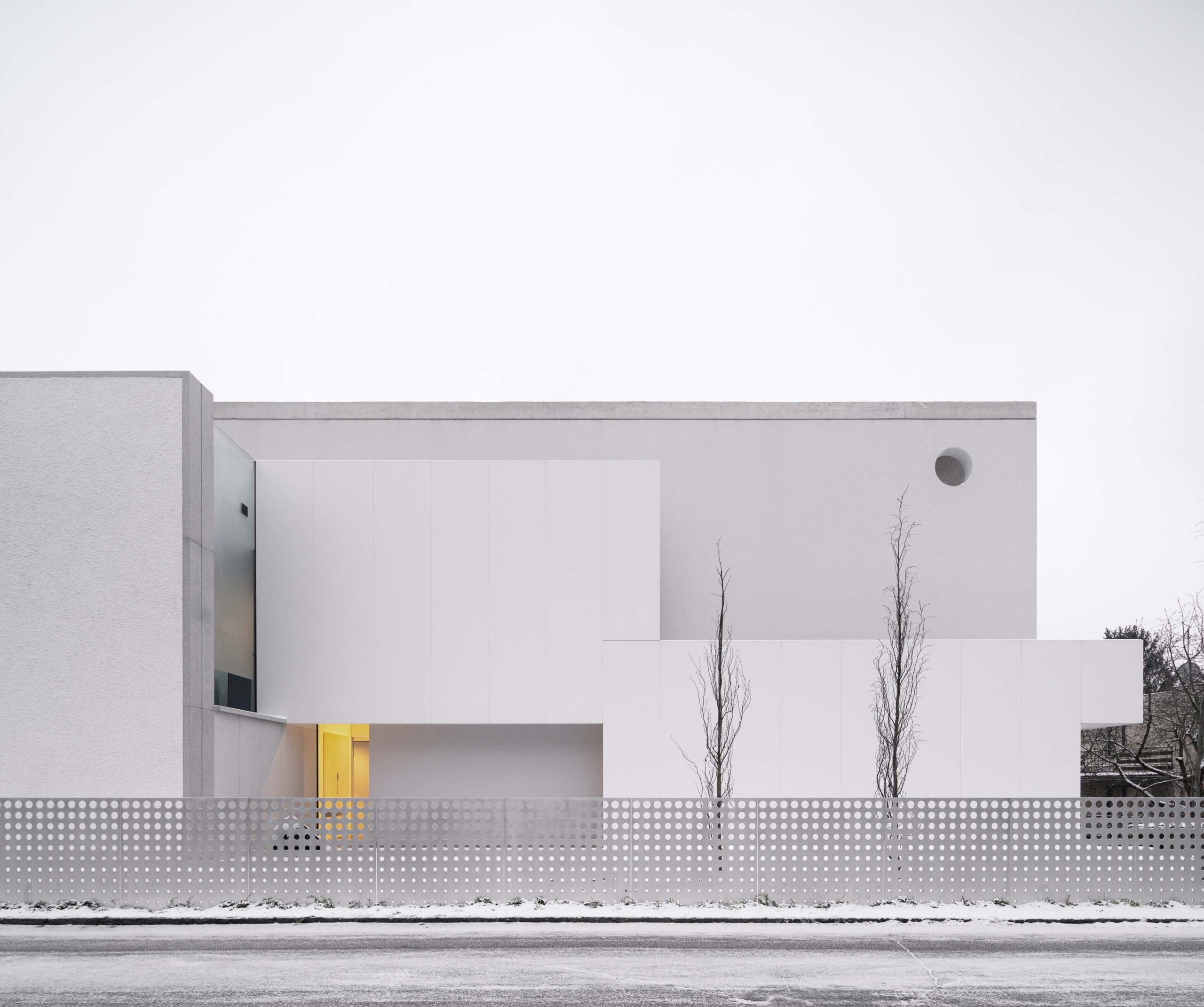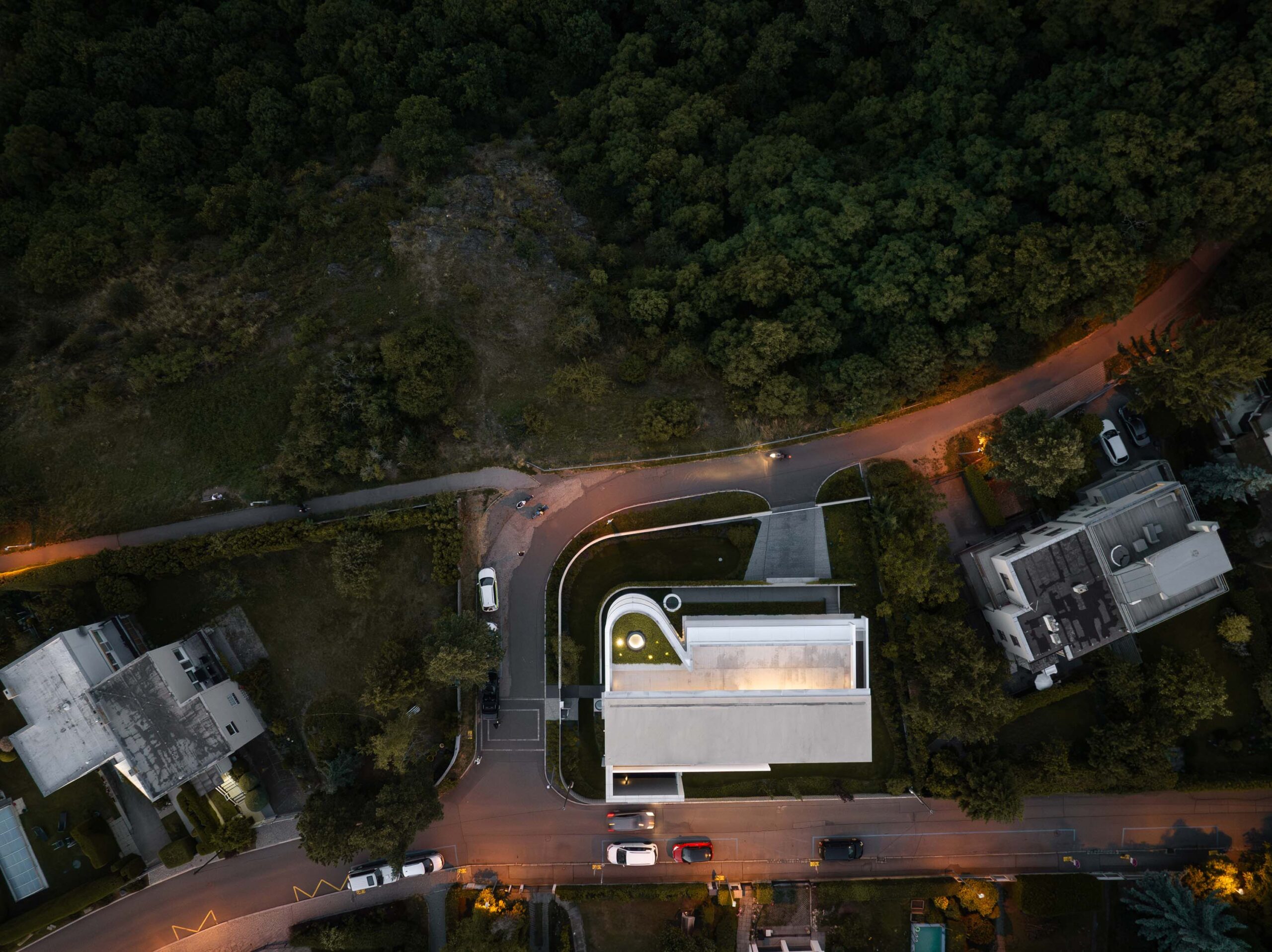 Do podzemního parkingu se vjíždí z jihozápadní části ve spodní hraně domu, pod úrovní terénu. Pemrlovaná betonová zídka je přerušena kovovou „žiletkou“ brány, která se elegantně zařezává do minimalistické zdi. Prvek nautického okénka se opakuje také v jemné, gradující mřížce nízkého plotu. Dům má v podzemí parkování pro několik vozů a posilovnu, naopak chybí bazén, protože majitelé svůj čas tráví v jižní Evropě v letním domě.