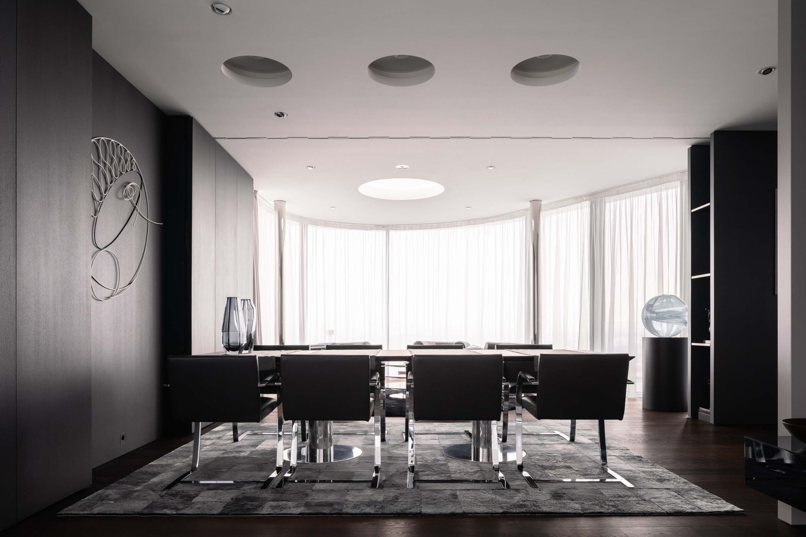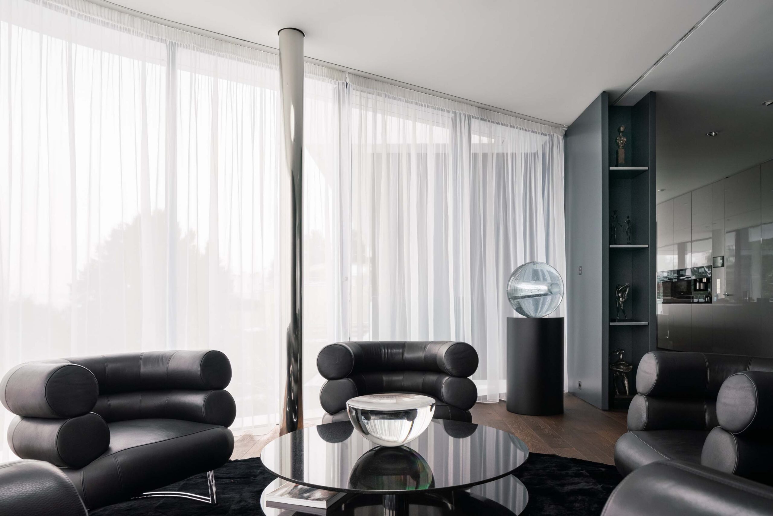 V prostorách několikapatrové vily je řada ploch, kde mají majitelé vystavená umělecká díla ze své sbírky. Architektův záměr byl dát vyznít uměleckým předmětům majitelů. V prostoru najdeme i mramorové stély – oblíbený prvek Radana Hubičky. Socha ve vnitřním atriu s bazénem je pak jasným odkazem na Miesův Barcelona pavilon (1929) s plastikou ženy. Architekt Radan Hubička ve vnitřním atriu pracuje s přirozeným světlem, které dopadá na vodní hladinu a mění náladu atria podle denní či noční doby. „Myslím, že celá realizace dobře dopadla a dům má vše, co majitelé pro pohodlný život chtěli. Při realizaci jsme nemuseli dělat prakticky žádný kompromis,“ komentuje architekt Radan Hubička výsledek pětileté práce, na níž se podíleli ti nejlepší čeští řemeslníci. Kromě interiérového čalounění alcantarou je v domě řada precizně provedených detailů a rafinovaně umístěných uměleckých děl.